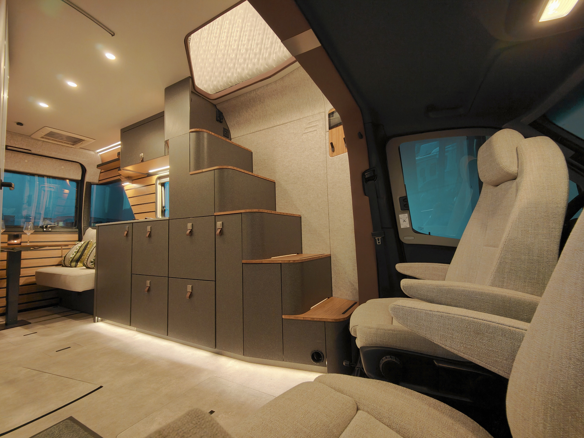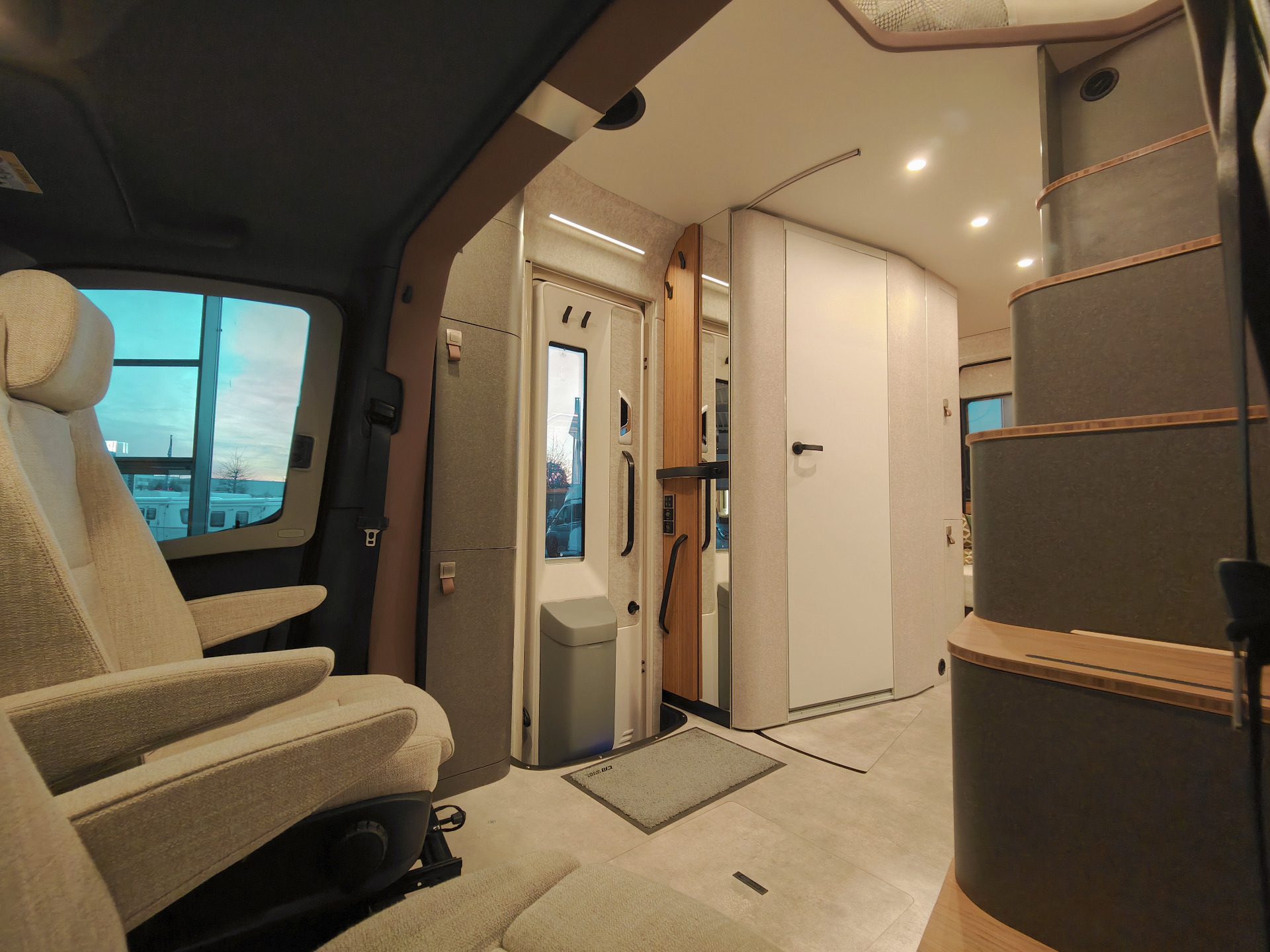 Der Hymer Venture S beeindruckt nicht nur mit seiner Leistung, sondern auch mit seinem stylischen und funktionalen Interieur. Mit dem drehbaren Beifahrersitz und dem ausklappbaren Schreibtisch inkl. Anschlüssen für 230V, USB und Internet wird Ihr Venture S zu einem vollausgestatteten mobilen Arbeitsplatz mit exellentem Sitzkomfort. Die Küche enthält alles, was Sie für ein Sterne-Menü benötigen. Das Bad bietet raffinierte Raumlösungen für komfortables Duschen. Die Private-Lounge im Heck ist ein Wohn- und Esszimmer inmitten einer dreiseitigen Panorama-Rundumsicht. Bei schönem Wetter wird das Heck zur überdachten Sonnenterrasse mit atemberaubendem Ausblick ausgeklappt.
